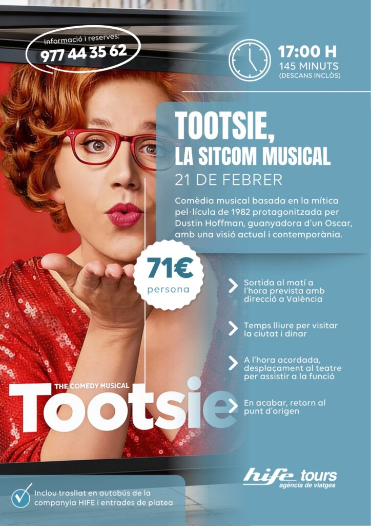 Gaudeix d’una escapada d’un dia a València per assistir a Tootsie, el musical, una comèdia fresca i divertida basada en la mítica pel·lícula de 1982, guanyadora d’un Oscar, reinterpretada amb una mirada actual i contemporània.