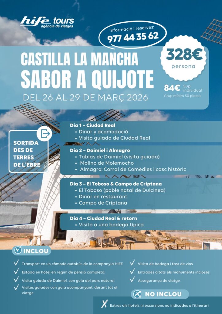 Descobreix una terra plena d’història, paisatges infinits i sabors autèntics en un viatge únic pel cor de Castella-la Manxa. Recorre escenaris emblemàtics del Quixot, visita molins de vent llegendaris, passeja per ciutats amb encant com Almagro i deixa’t sorprendre pels parcs naturals, la gastronomia i els vins de la regió.